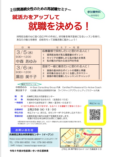 【3/5(水),3/6(木)開催】2日間連続 女性のための再就職セミナー「就活力をアップして 就職を決める!」の受講者募集 – 兵庫県立男女共同参画センター・イーブンhttps://hyogo-even.jp/seminar/%e3%80%903-5%ef%bc%88%e6%b0%b4%ef%bc%893-6%ef%bc%88%e6%9c%a8%ef%bc%89%e9%96%8b%e5%82%ac%e3%80%91%ef%bc%92%e6%97%a5%e9%96%93%e9%80%a3%e7%b6%9a-%e5%a5%b3%e6%80%a7%e3%81%ae%e3%81%9f%e3%82%81%e3%81%ae.html